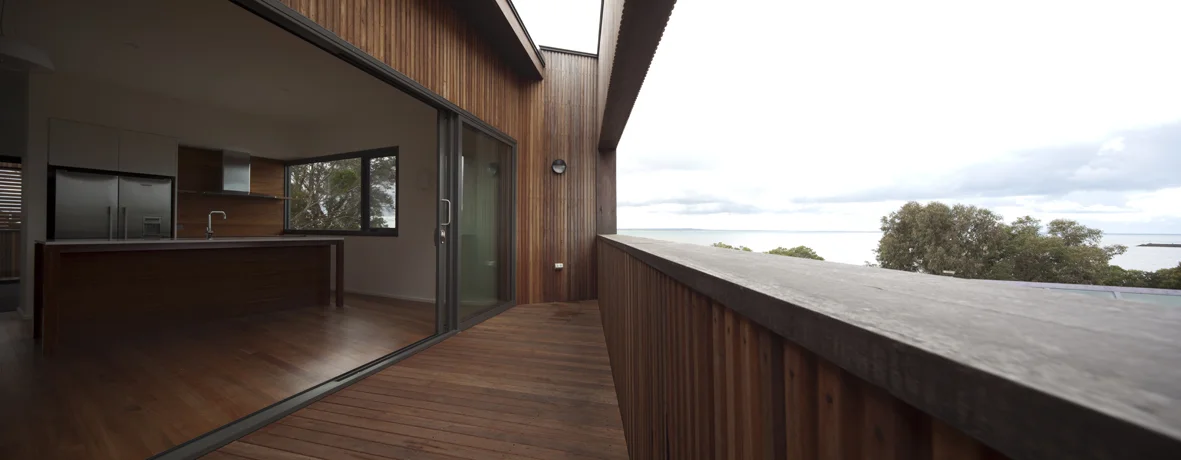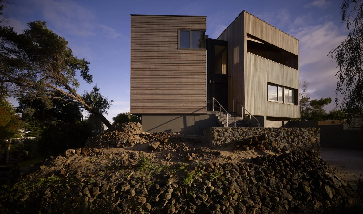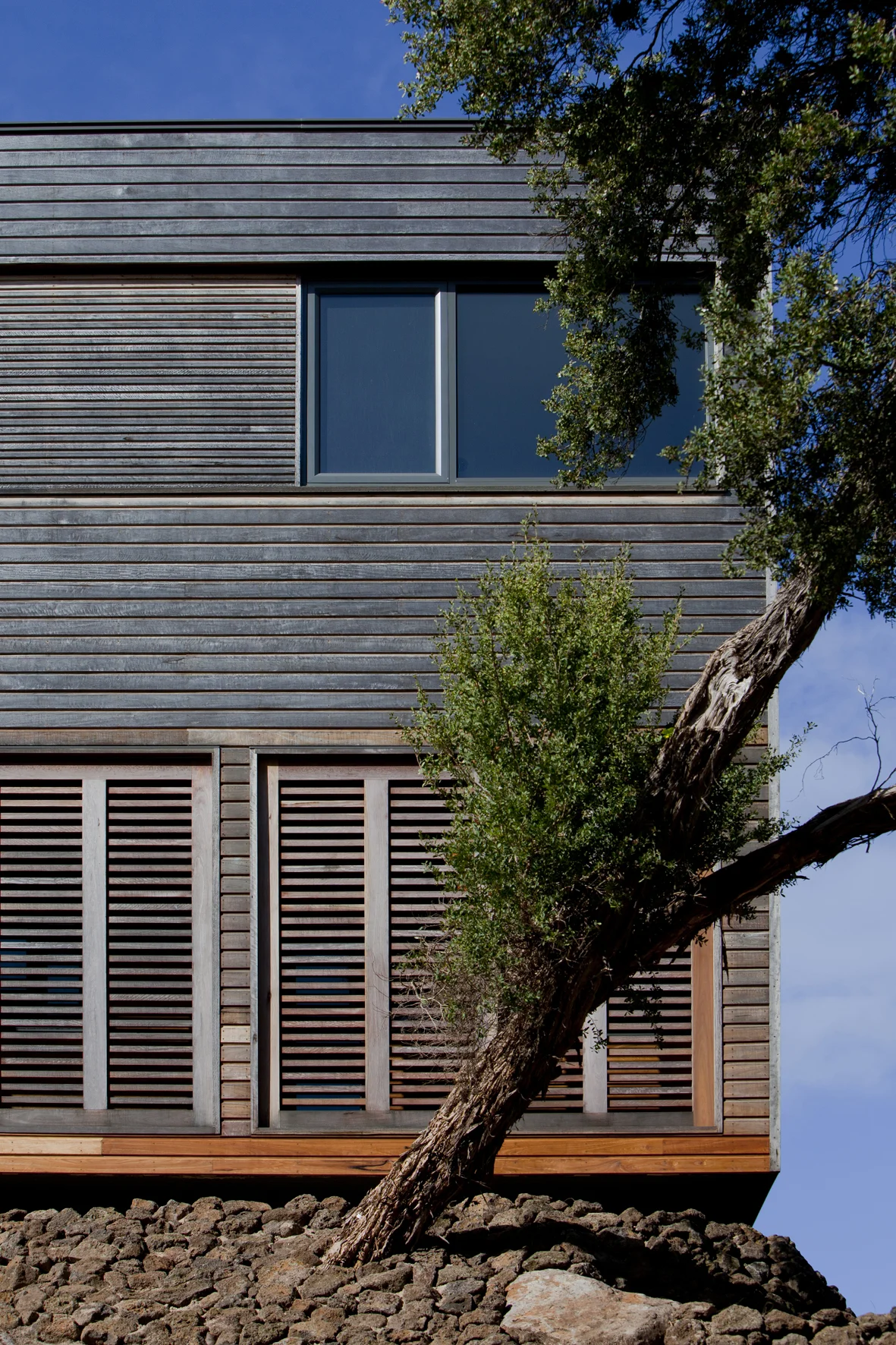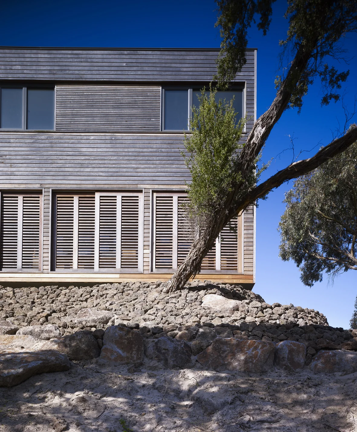 Nestled among the tea-trees to take advantage of open bay views, this house is split into 2 living zones - the PM 'after-dark' and the AM 'daylight' zone.